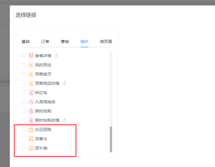 选择链接插件中,增加社区团购插件(导航图标、图片魔方、标签栏、用户中心、招募团长)