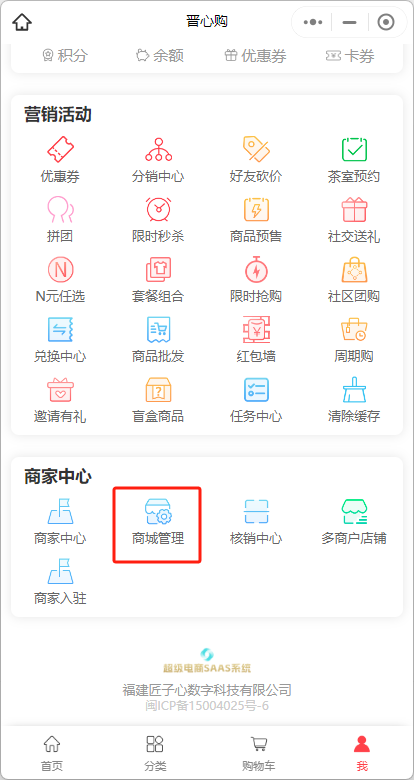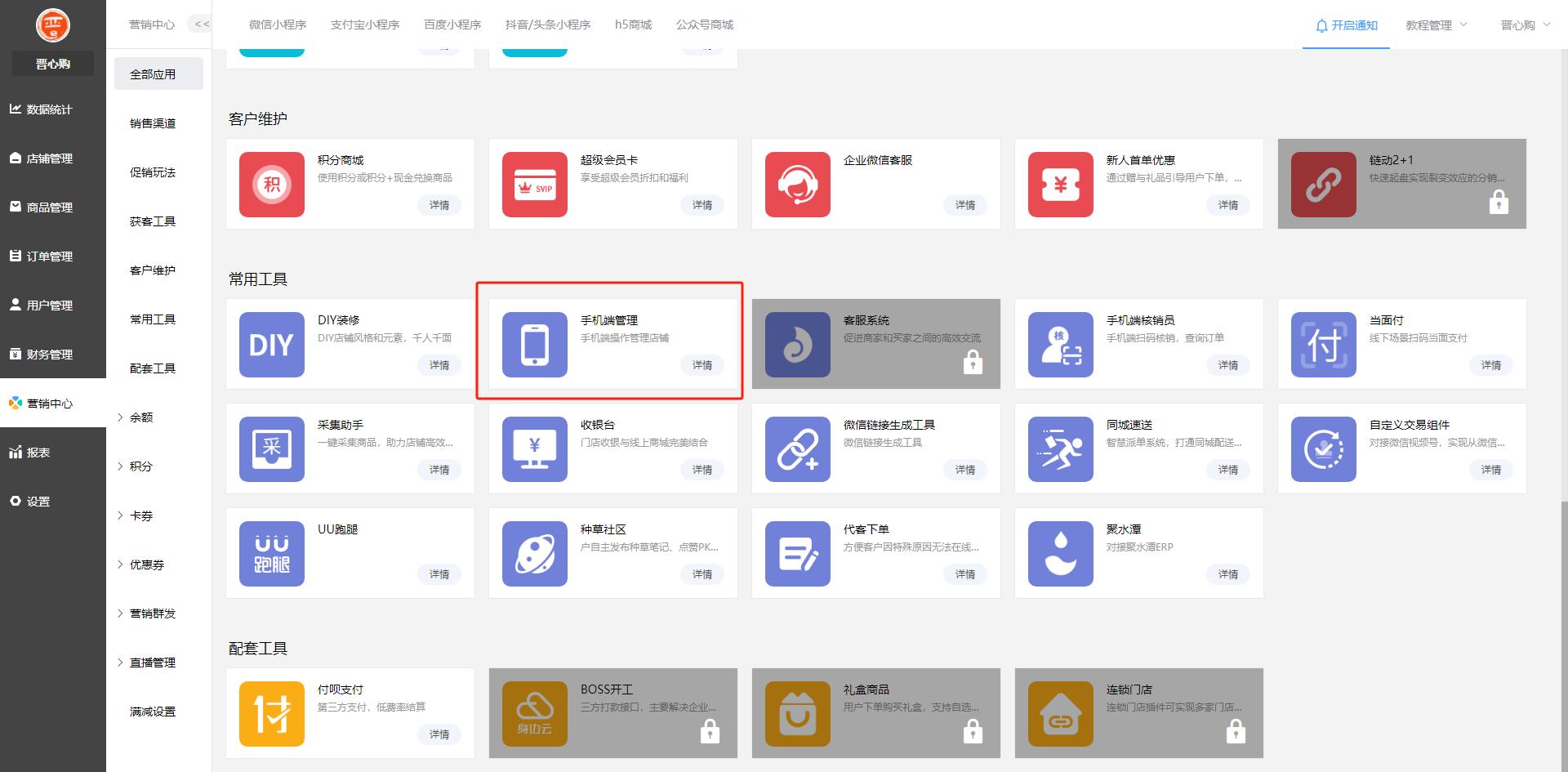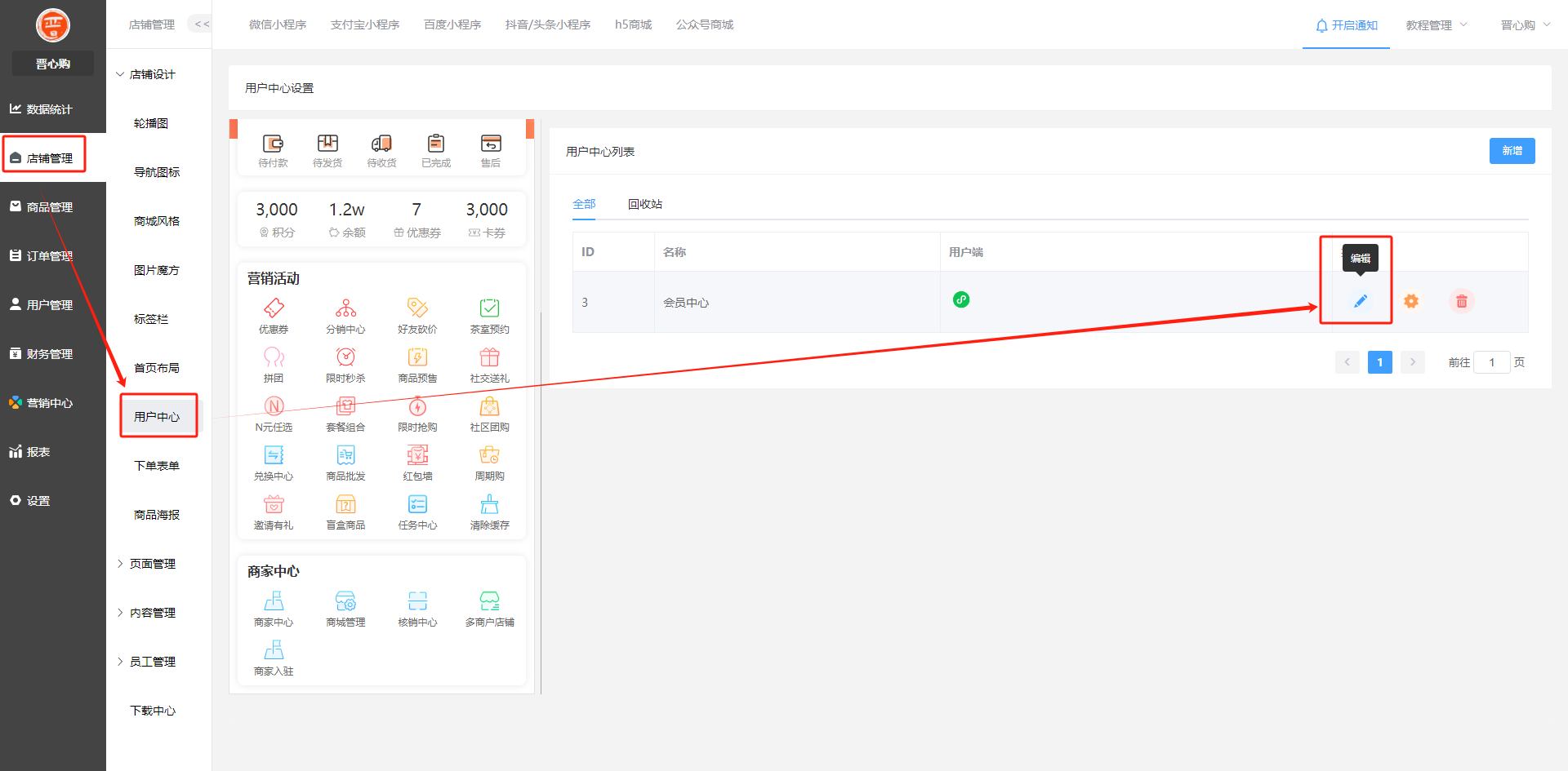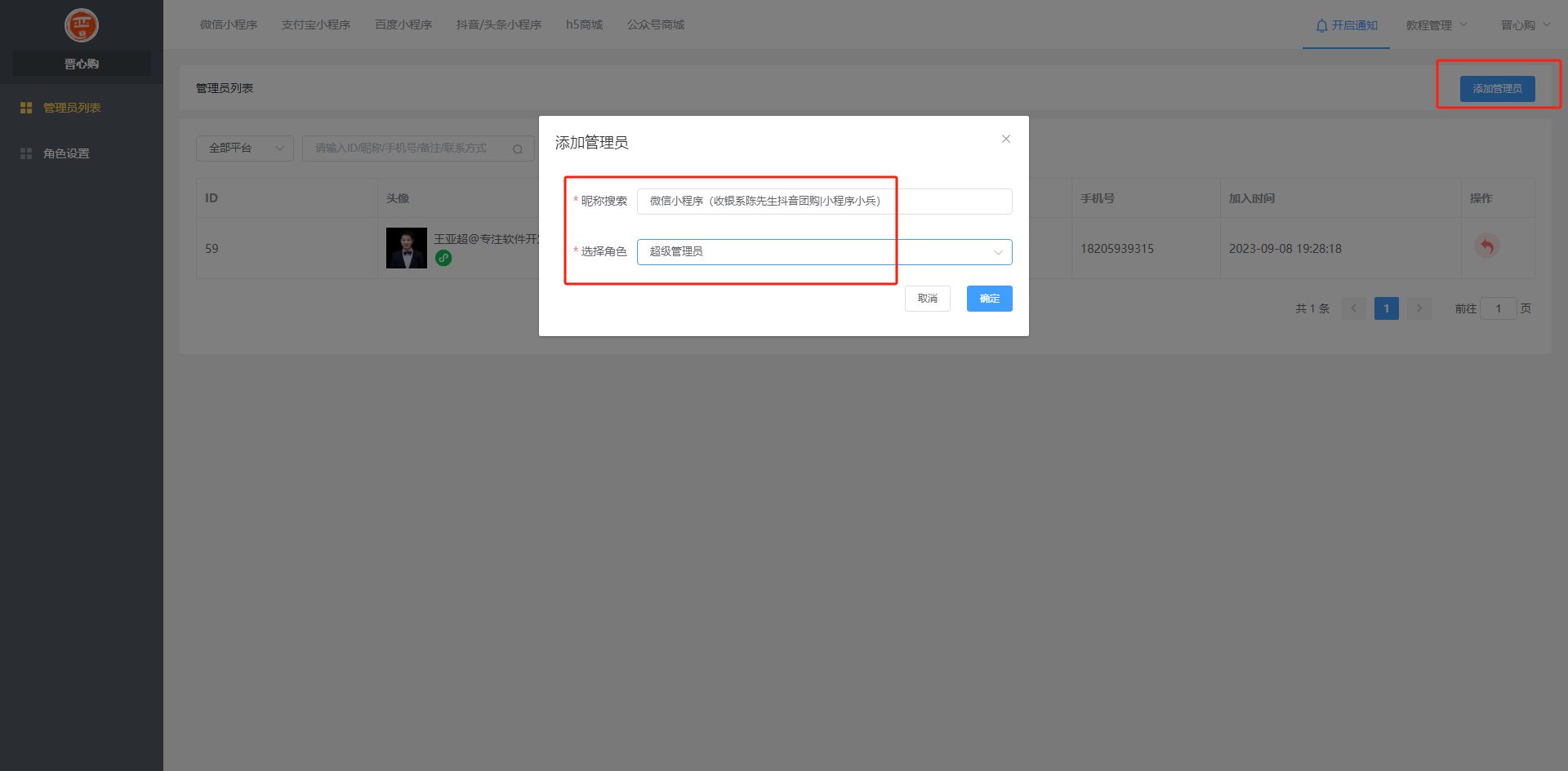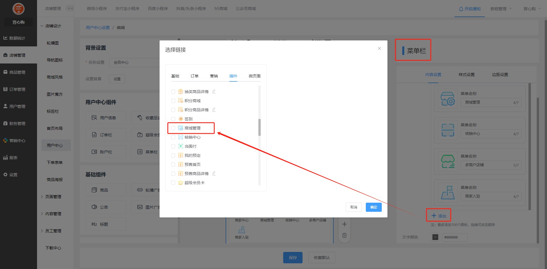 安装完插件后,在管理员列表添加管理员添加完后去小程序管理-->用户中心选择插件-->商城管理。