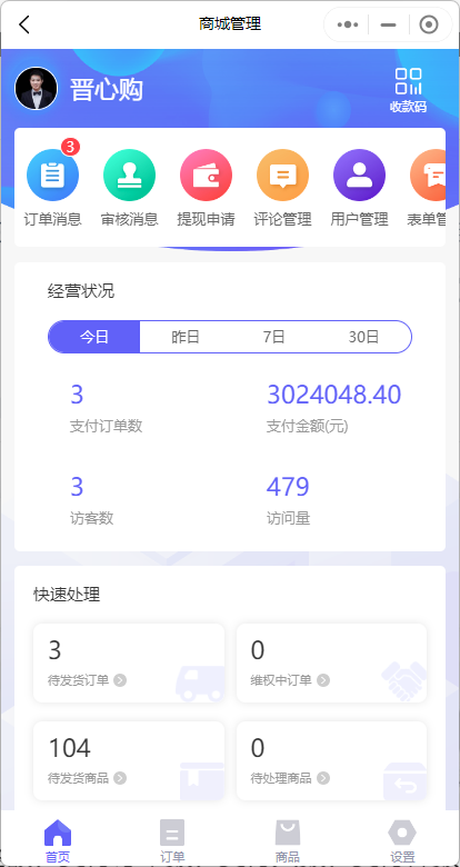 • 首页的订单消息:用户下单、申请取消订单(也叫退款提醒)、申请售后的时候首页出现数字提醒,直到操作该笔订单。点击订单,可以直接进行查看处理
