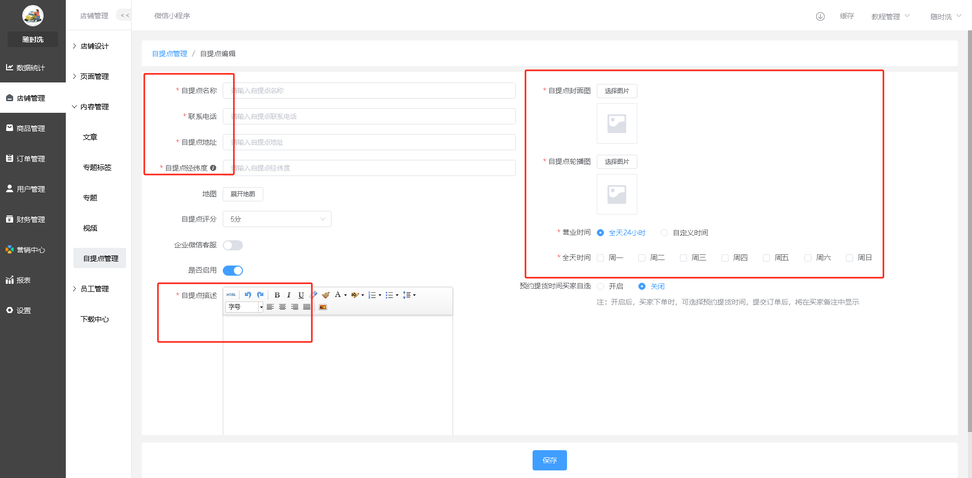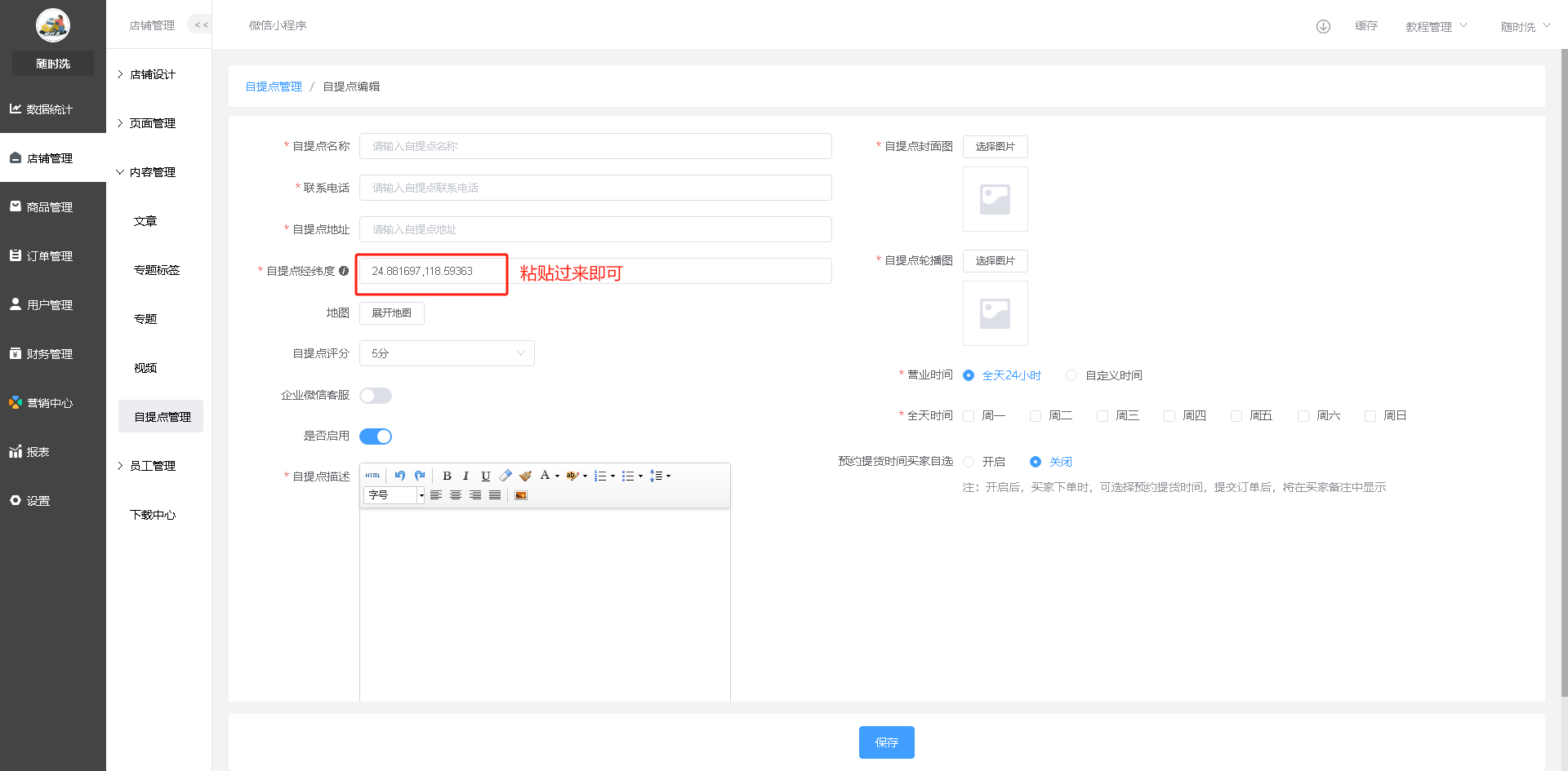 添加路径:店铺管理--内容管理--自提点管理--添加自提点