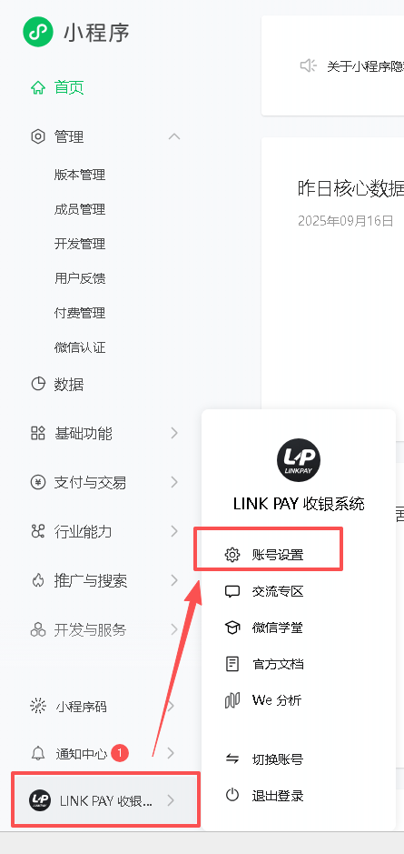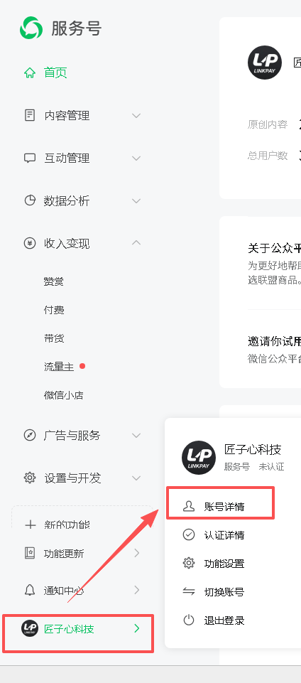 2、进入设置页面:在左侧菜单栏中,点击底部 公众号/小程序的名称,然后点击“账号设置”(小程序) 或者 “账号详情”(公众号)