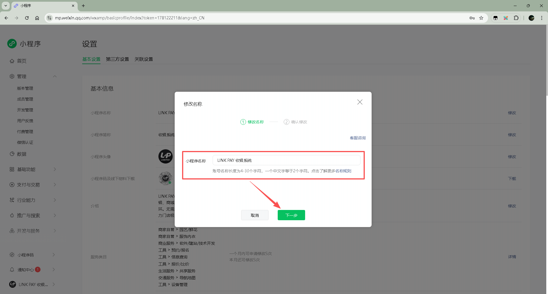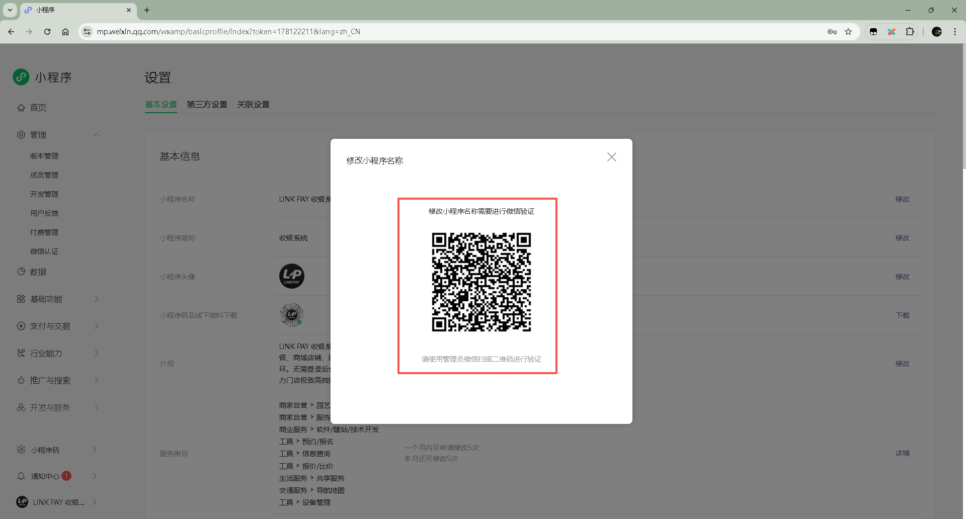 3、开始修改:点击名称的 “修改” 按钮。管理员微信扫码验证。进入修改页面后,输入想要的新名称,并确认该名称符合平台的命名规范。系统会对新名称进行可用性检查,确保名称没有违反相关规定且未被其他公众号使用。